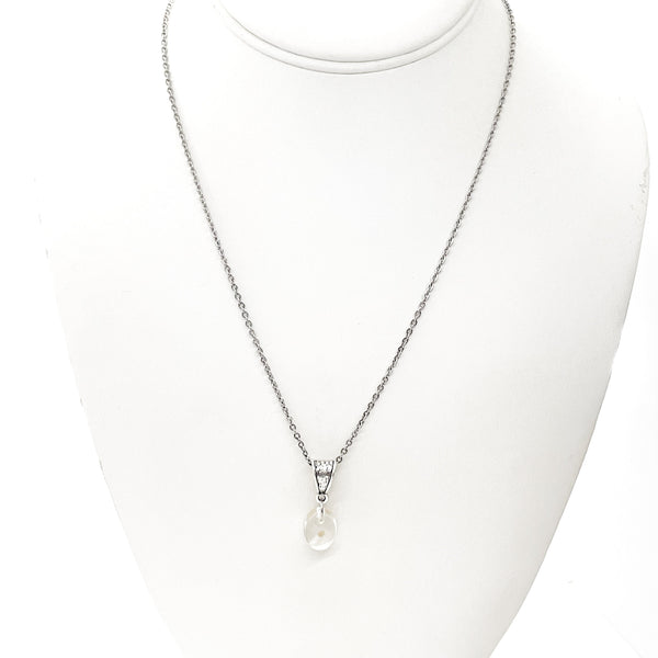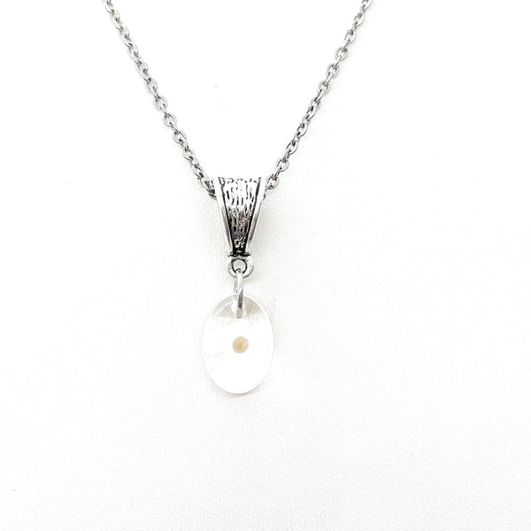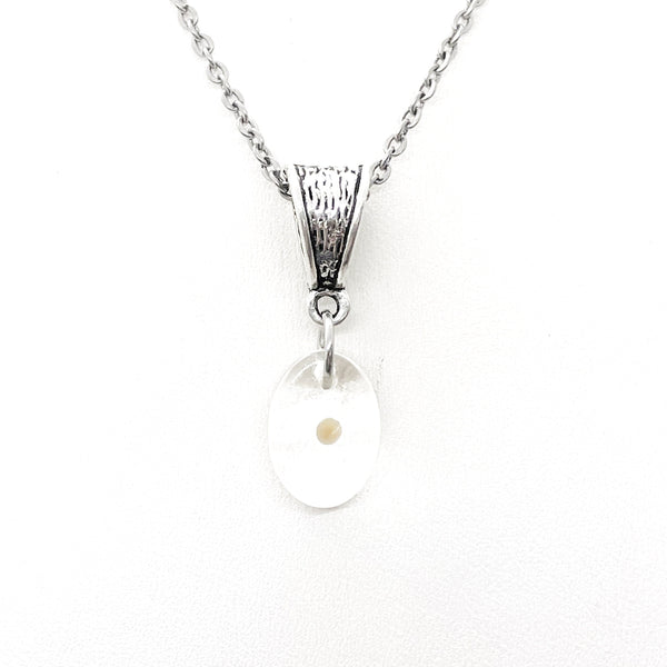 This is a clear resin mustard seed pendant on a stainless steel link chain. The pendant has a flat back to allow it to lie smoothly agains your clothing or skin. This pendant is available on your choice of 16, 18, 20, 22, 24, 26, 28 or 30 inch chain. The pendant is also available for individual purchase if you have another chain on which you would like to wear it. The charm measures approx. 3/4 inch in length.