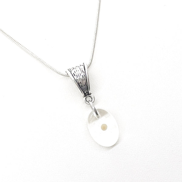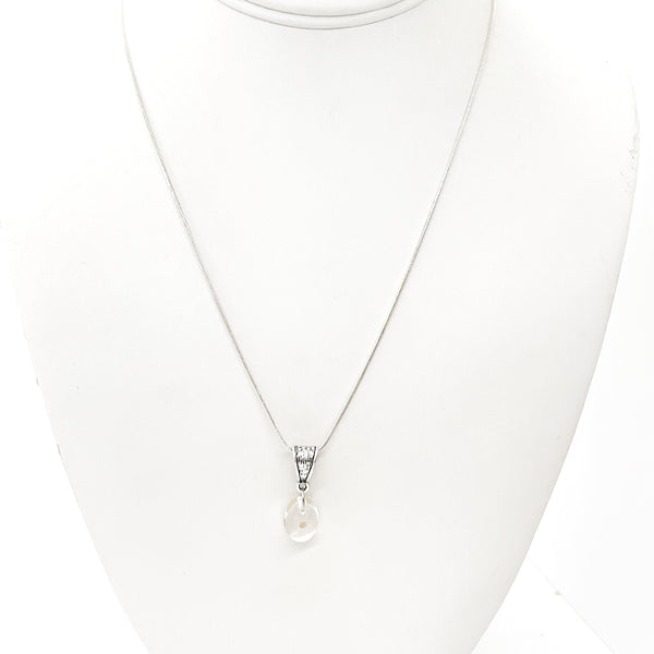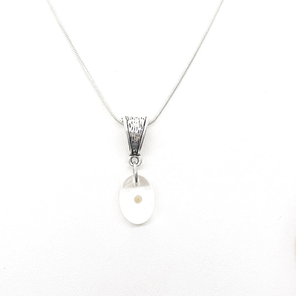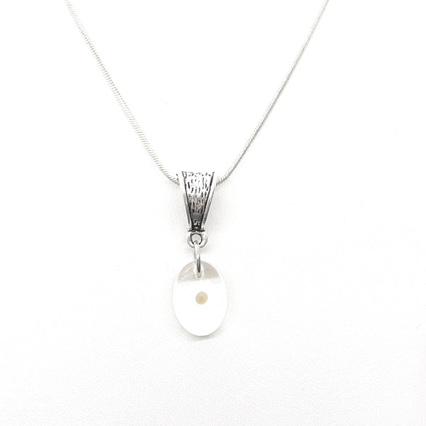 This is a clear resin mustard seed pendant on a silver-plated chain. The pendant has a flat back to allow it to lie smoothly agains your clothing or skin. This pendant is available on your choice of 16, 18, 20, 22, 24, 26, 28 or 30 inch chain. The pendant is also available for individual purchase if you have another chain on which you would like to wear it. The charm measures approx. 1/2 inch in length.