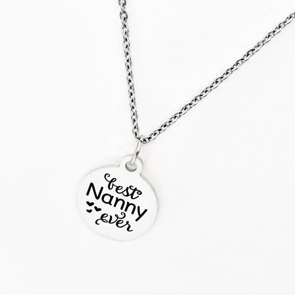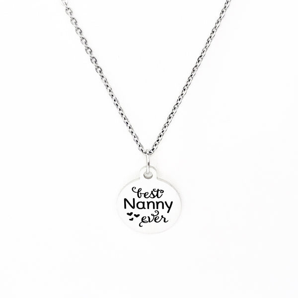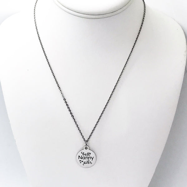This is a simple but classic pendant necklace. The pendant is a stainless steel laser engraved charm that has “Best Nanny Ever” on it. This pendant is available on your choice of 16, 18, 20, 22, 24, 26, 28 or 30 inch chain. The pendant is also available for individual purchase if you have another chain on which you would like to wear it. The pendant measures approx. 3/4 inch across.