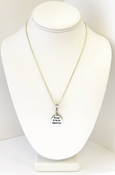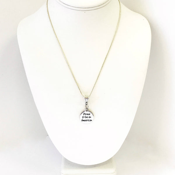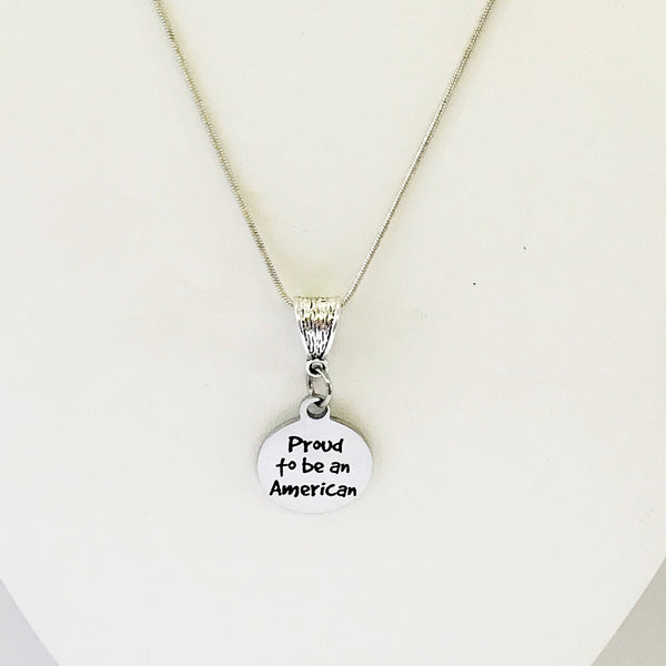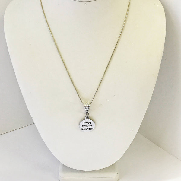 Show your pride in the USA with this silver necklace that has a laser engraved stainless steel charm with "Proud to be an American" on it.