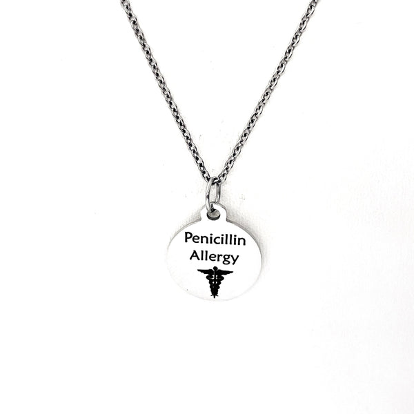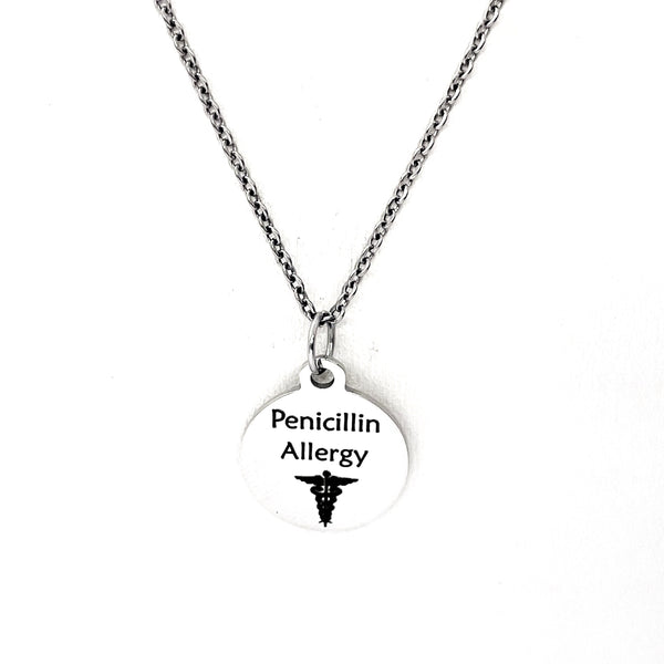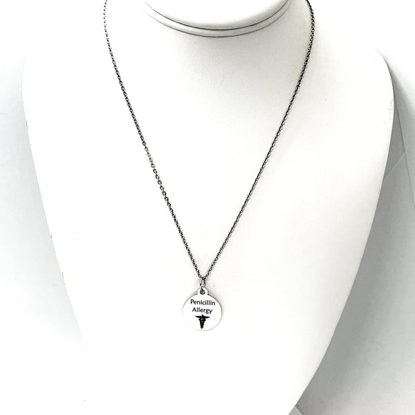 This is a stainless steel laser engraved pendant on a stainless steel chain. The pendant has “Penicillin Allergy” and a medical caduceus symbol on it. This pendant is available on your choice of 16, 18, 20, 22, 24, 26, 28 or 30 inch chain. The pendant is also available for individual purchase if you have another chain on which you would like to wear it. For an additional charge, the charm can be customized to meet your specific needs.