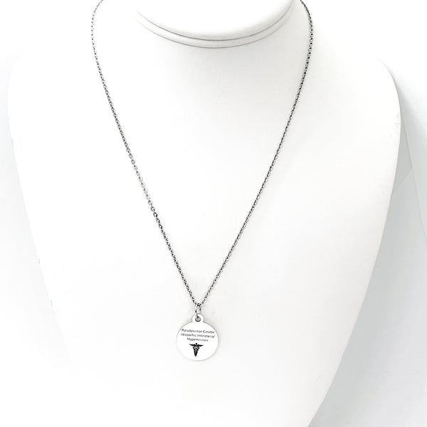 This is a stainless steel laser engraved pendant on a stainless steel chain. The pendant has “Pseudotumor Cerebri Idiopathic Intercranial Hypertension” and a medical caduceus symbol on it. This pendant is available on your choice of 16, 18, 20, 22, 24, 26, 28 or 30 inch chain. The pendant is also available for individual purchase if you have another chain on which you would like to wear it. For an additional charge, the charm can be customized to meet your specific needs.