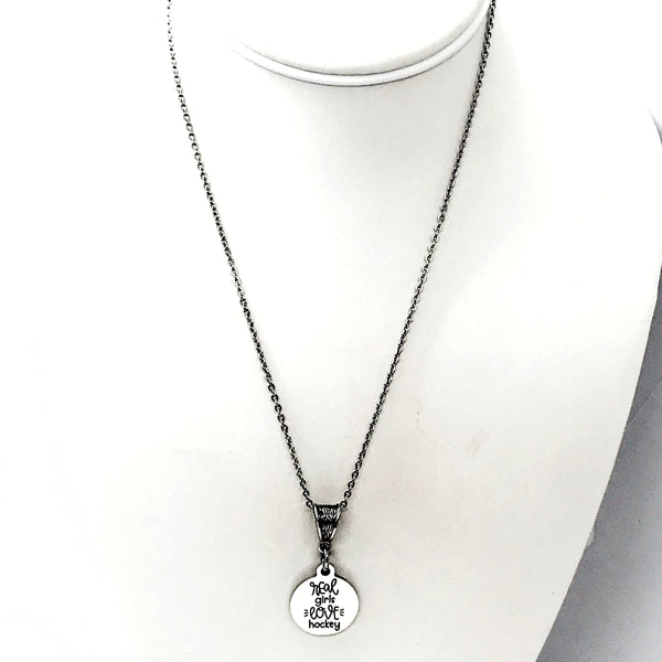 The is a beautiful jewelry piece that has a stainless steel laser engraved charm with “Real girls love hockey” on it. The charm measures approx. 3/4 inch across.