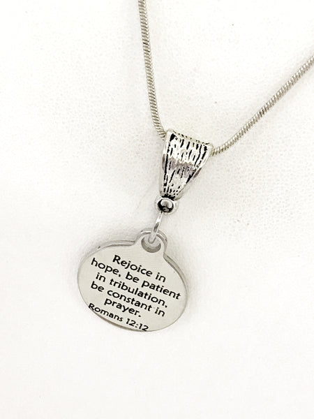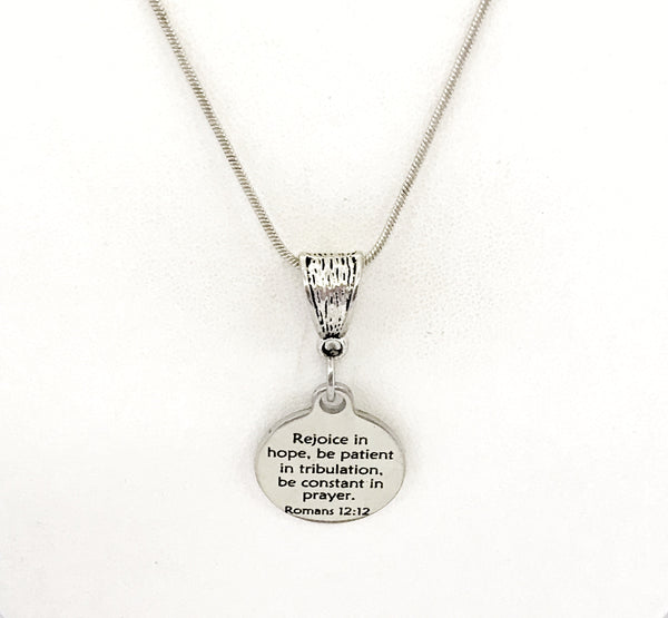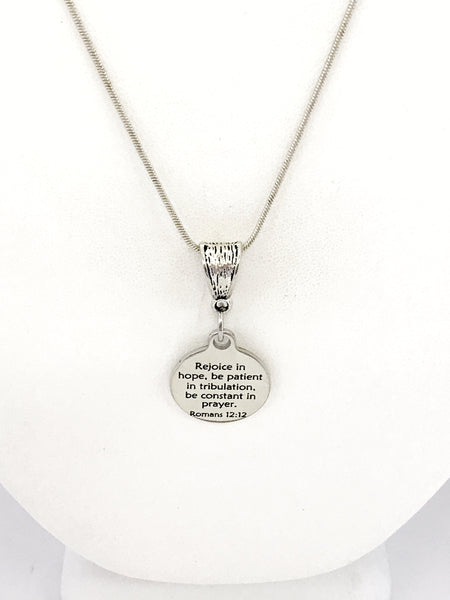 This is a beautiful encouraging necklace jewelry gift. It has a stainless steel laser engraved charm with the following Bible Verse on it: