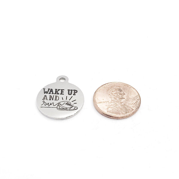 The is a beautiful jewelry piece that has a stainless steel laser engraved charm with the following on it “Wake up and Run”.
