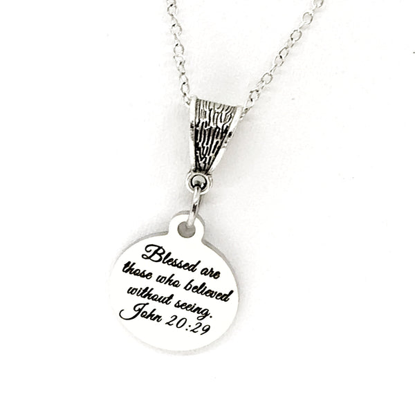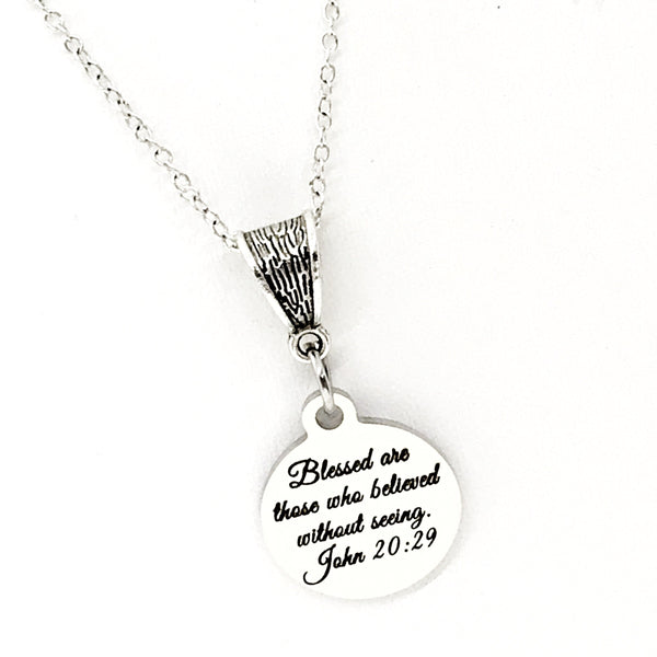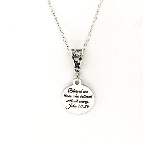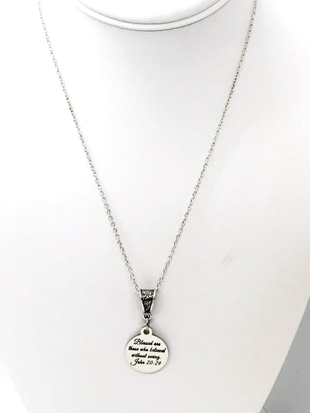 The is a beautiful jewelry piece that has a stainless steel laser engraved charm with “Blessed are those who believed without seeing” from John 20:29 on it. The charm measures approx. 3/4 inch across.