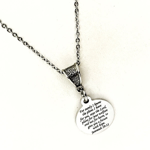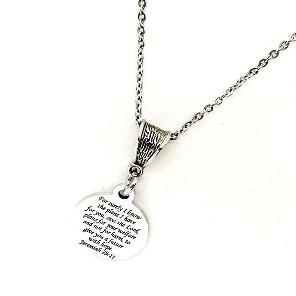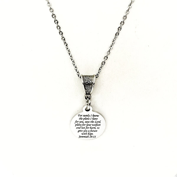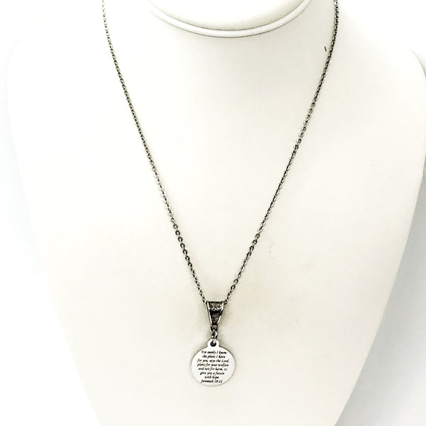 The is a beautiful jewelry piece that has a stainless steel laser engraved charm with “For surely I know the plans I have for you, says the Lord, plans to for your welfare and not for harm, to give you a future with hope” from Jeremiah 29:11 on it. The charm measures approx. 3/4 inch across.