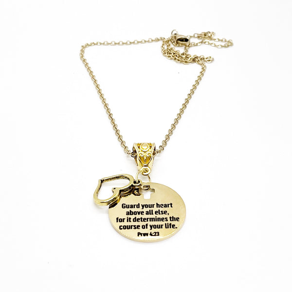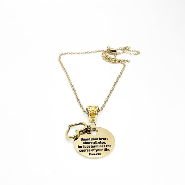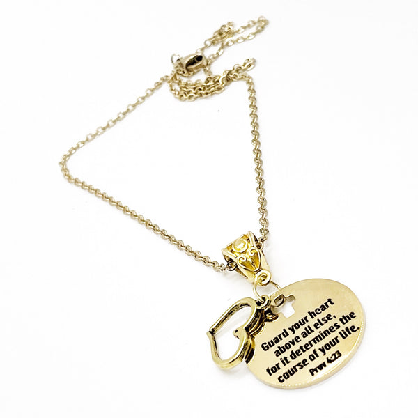 This is a Gold-plated brass necklace with a Gold-plated stainless steel laser engraved pendant with “Guard your heart above all else for for it determines the course of your life" from Proverbs 4:23 on it. This pendant is available on your choice of 16, 18, 20, 22, 24, 26, 28 or 30 inch chain.