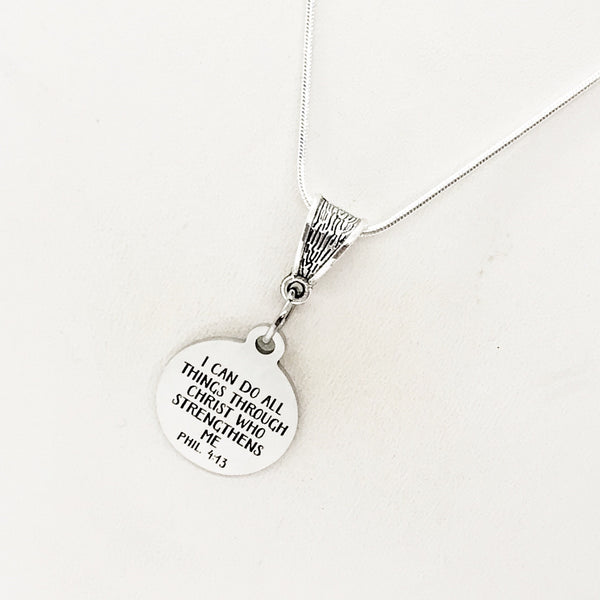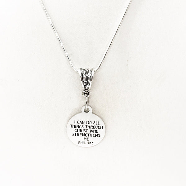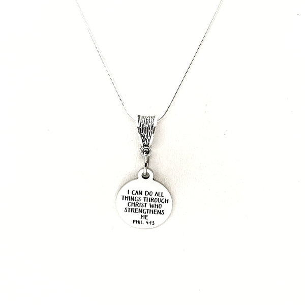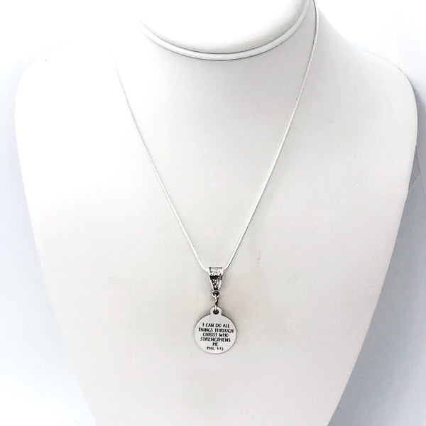 This is a stainless steel laser engraved pendant on a silver-plated snake chain. The pendant has "I can do all things through Christ who strengthens me" from Philippians 4:13 on it. This pendant is available on your choice of 16, 18, 20, 22, 24, 26, 28 or 30 inch chain. The pendant is also available for individual purchase if you have another chain on which you would like to wear it.