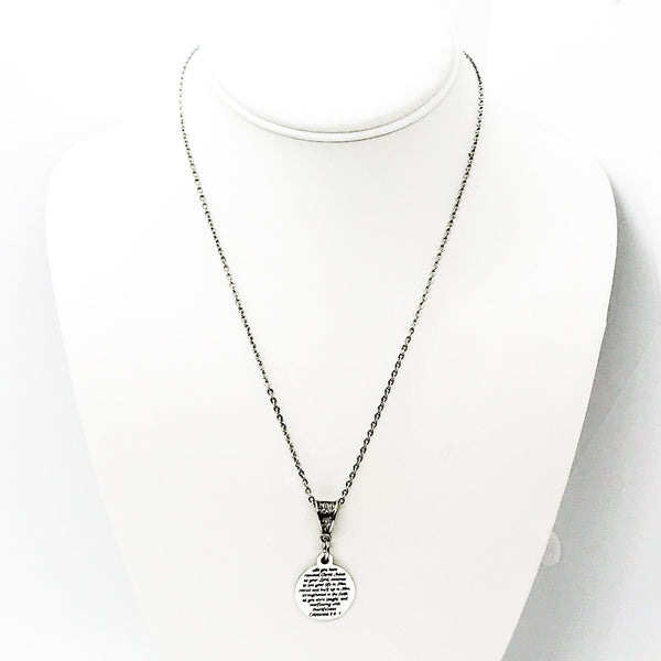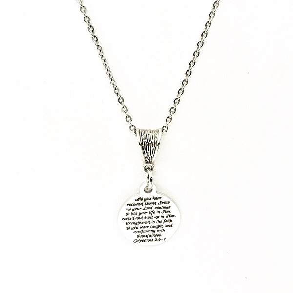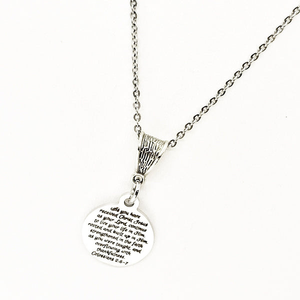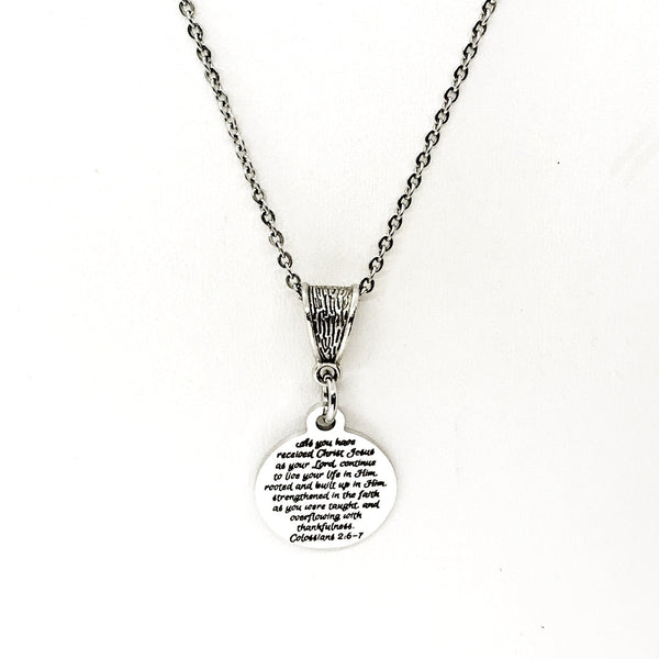 This is a stainless steel laser engraved pendant on a stainless steel link chain with a silvertone bale. The pendant says “As you have received Christ Jesus as your Lord continue to live your life in Him, rooted and built up in Him, strengthened in the faith as you were taught and overflowing with thankfulness” from Colossians 2: 6 and 7. Please note that this charm contains a lot of text and as such, the font is small. The bookmark is intended to be a reminder to the owner and allow them to share their faith,