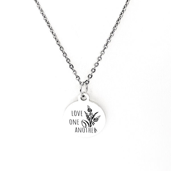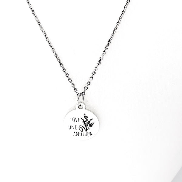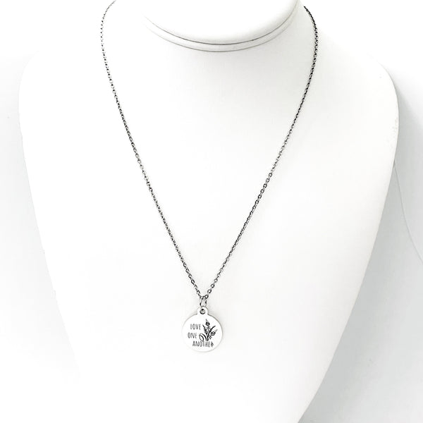 This is a stainless steel laser engraved pendant on a stainless steel chain. The pendant has “Love one another” on it. This pendant is available on your choice of 16, 18, 20, 22, 24, 26, 28 or 30 inch chain. The pendant is also available for individual purchase if you have another chain on which you would like to wear it. For an additional charge, the charm can be customized to meet your specific needs.
