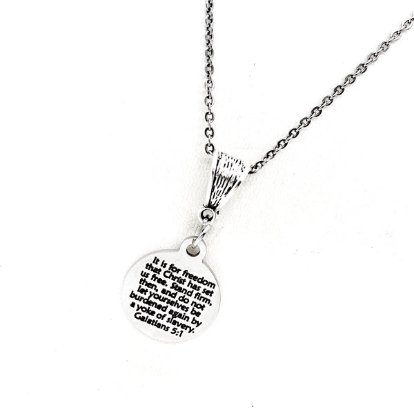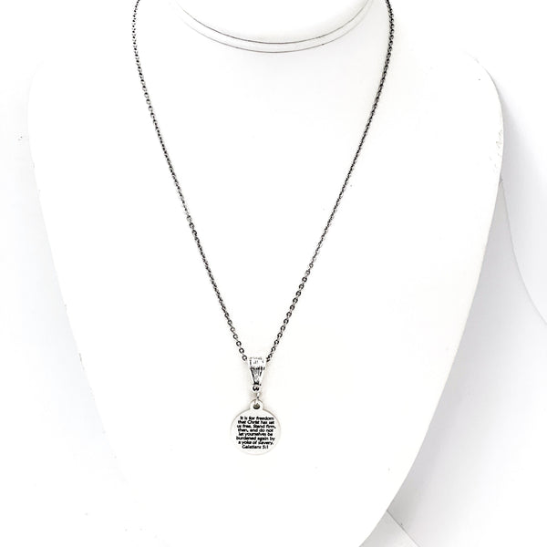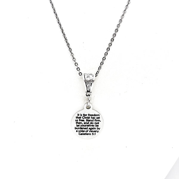 This beautiful necklace would make a wonderful gift. The pendant is a stainless steel laser engraved pendant that has “It is for freedom that Christ has set us free. Stand firm, then and do not let yourselves be burdened by a yoke of slavery” from Galatians 5:1 on it.