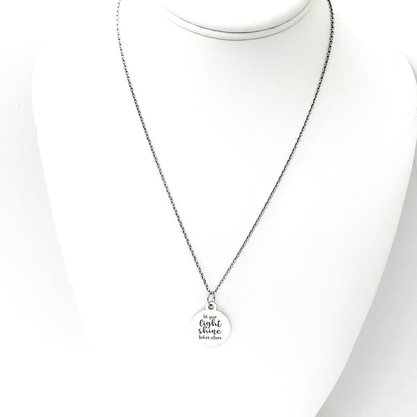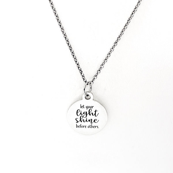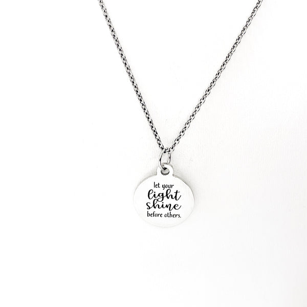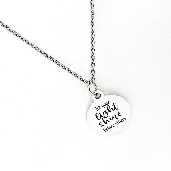 This is a stainless steel laser engraved pendant on a stainless steel chain. The pendant has “Let your light shine before others” on it. This pendant is available on your choice of 16, 18, 20, 22, 24, 26, 28 or 30 inch chain. The pendant is also available for individual purchase if you have another chain on which you would like to wear it. For an additional charge, the charm can be customized to meet your specific needs.