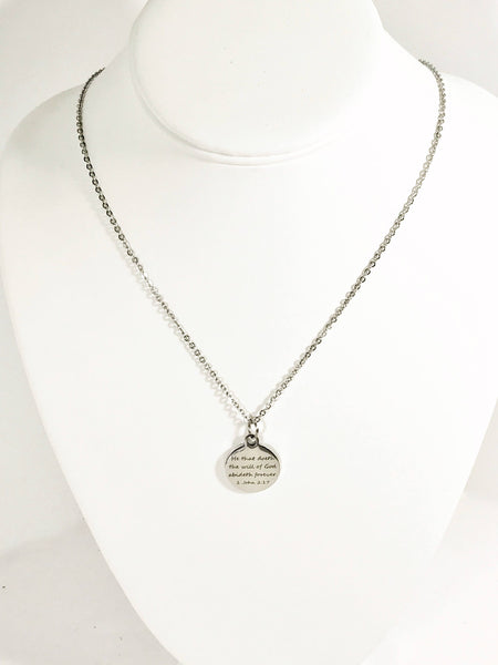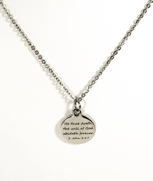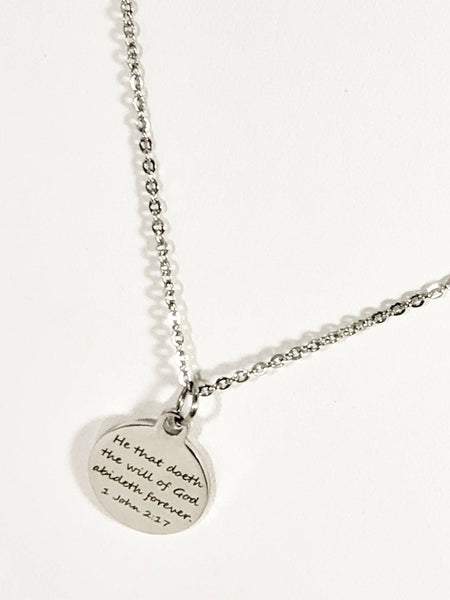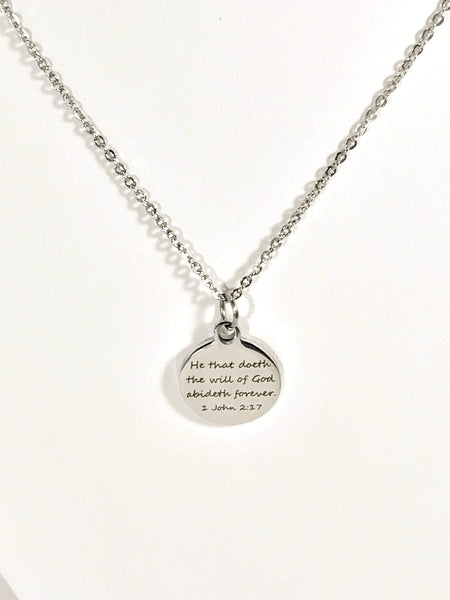 This necklace would be a great gift to encourage someone along their Christian walkl. This is a stainless steel laser engraved pendant on a stainless steel chain. The pendant has "He that doeth the will of God abideth forever" from 1 John 2:17 on it. This pendant is available on your choice of 16, 18, 20, 22, 24, 26, 28 or 30 inch chain. The pendant is also available for individual purchase if you have another chain on which you would like to wear it.