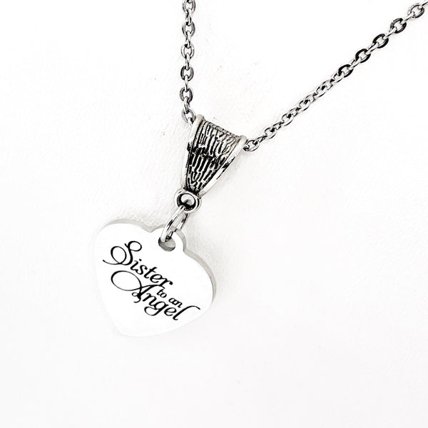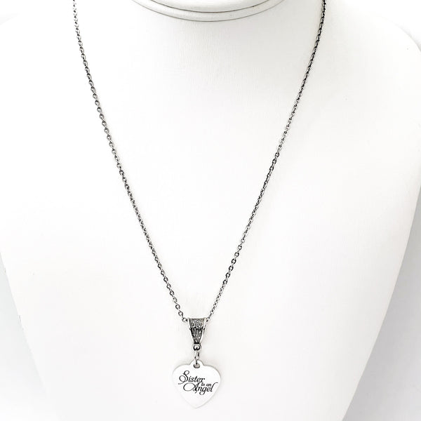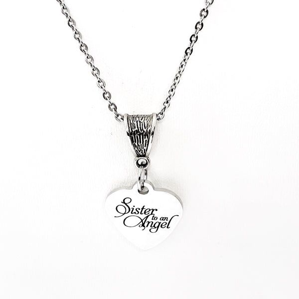 This is a stainless steel laser engraved pendant on a stainless steel link chain chain. The pendant says “Sister to an Angel”