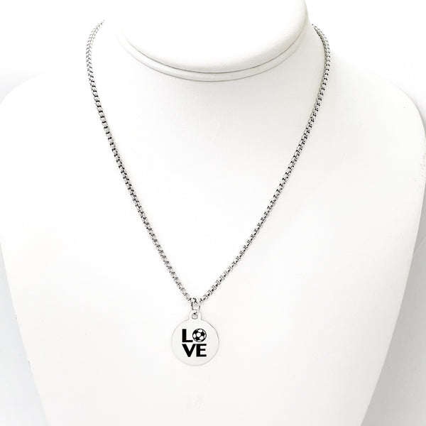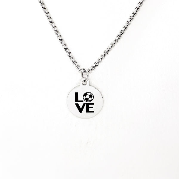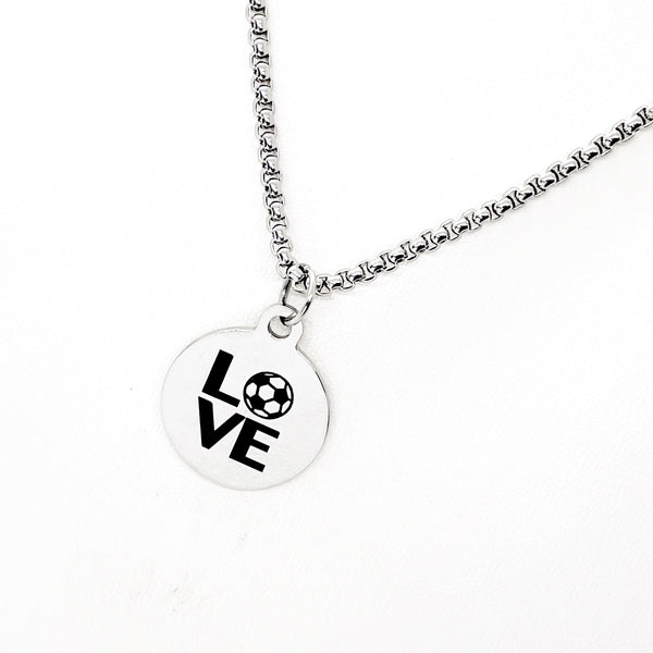 The piece is stainless steel laser engraved charm on a 22 inch ball chain. It has “LOVE” with a soccer ball where the O is on it.