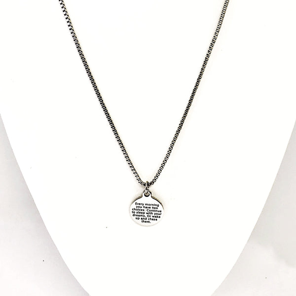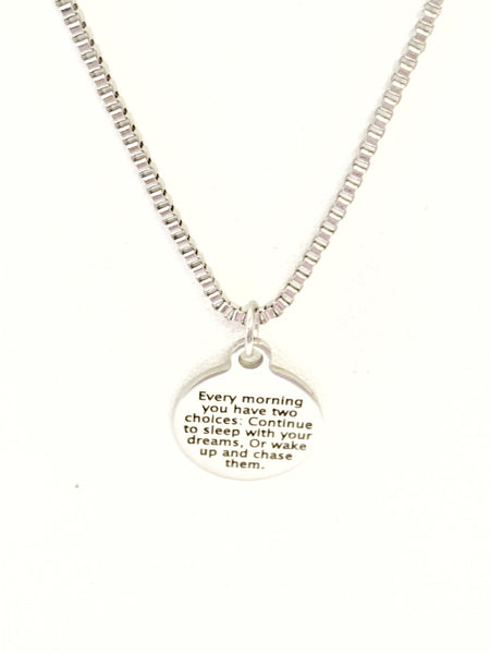 This is great necklace gift to remind the wearer to chase dreams daily. This necklace comes with a stainless steel laser engraved charm pendant on a 22 inch stainless steel box chain. The pendant has “Each morning you have two choices: Continue to sleep with your dreams, Or wake up and chase them” on it.