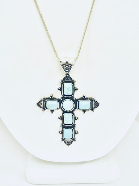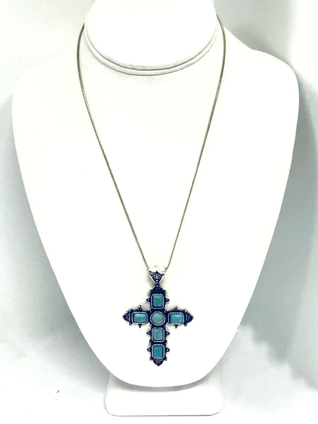 This beautiful silvertone cross necklace would make the perfect complement to your southwestern style outfit! The cross measures approx. 2 3/4” by 1 13/16” and has simulated turquoise stones.