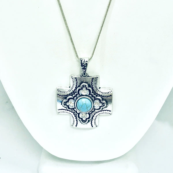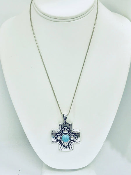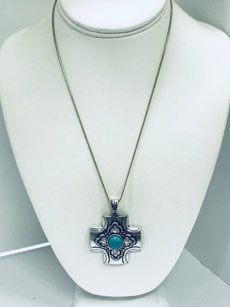 This beautiful silvertone cross necklace would make the perfect complement to your southwestern style outfit! The cross measures approx. 1 3/4” by 1 1/2” and has a simulated turquoise center.