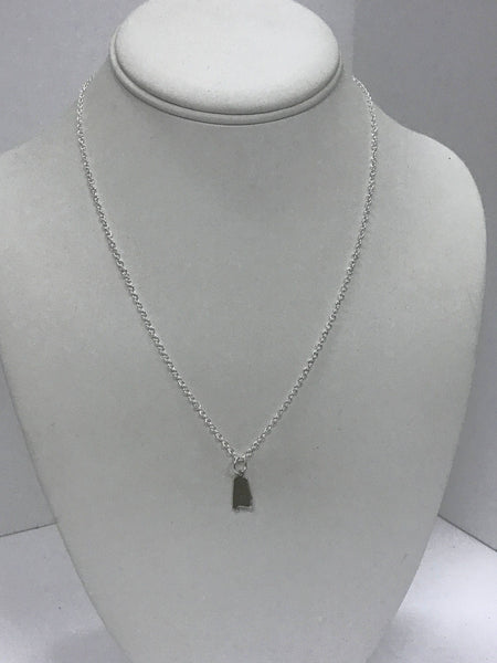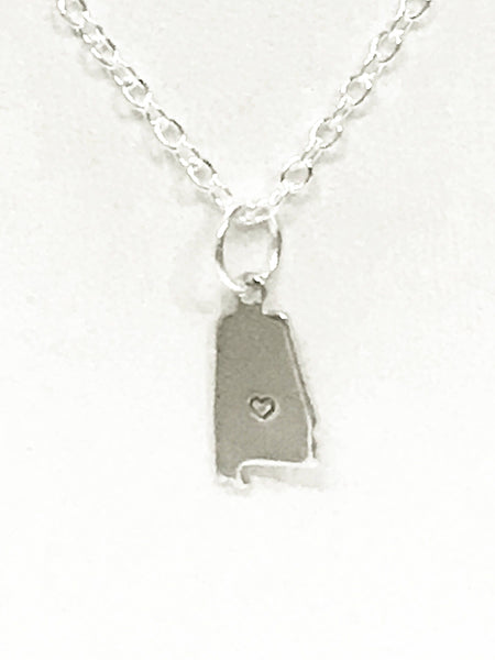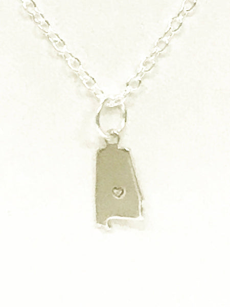 This is a beautiful silver state-shaped pendant with a heart stamped on it on a sterling silver plated chain. This would be a wonderful way to show your love for your home state or a great gift to give someone that is moving. This pendant is available on your choice of 16, 18, 20, 22, 24 or 26 inch chain.