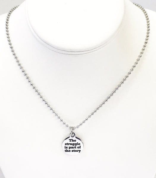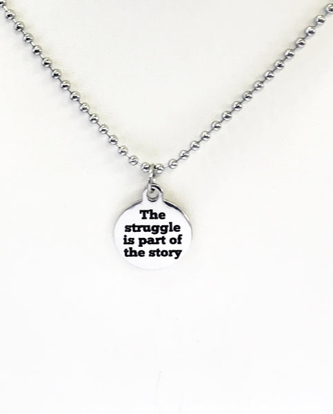 This necklace would make a great sympathy or encouraging gift. The pendant is a laser engraved charm on a 24 inch stainless steel ball chain. The charm has "The struggle is part of the story" on it.