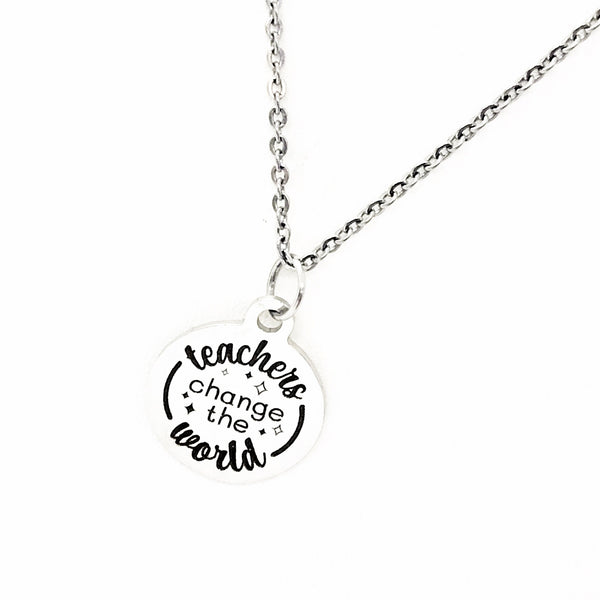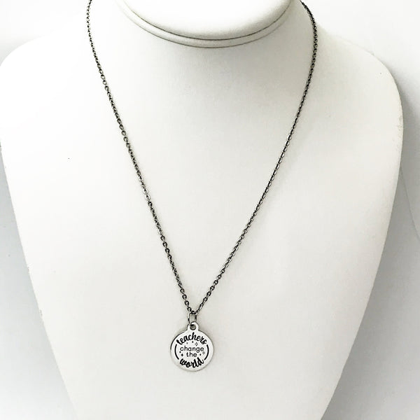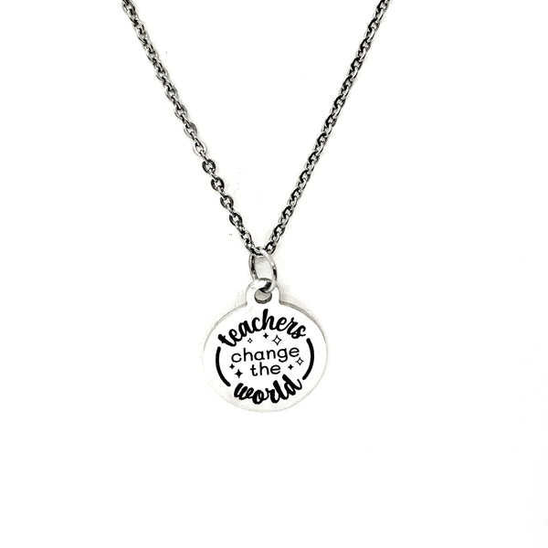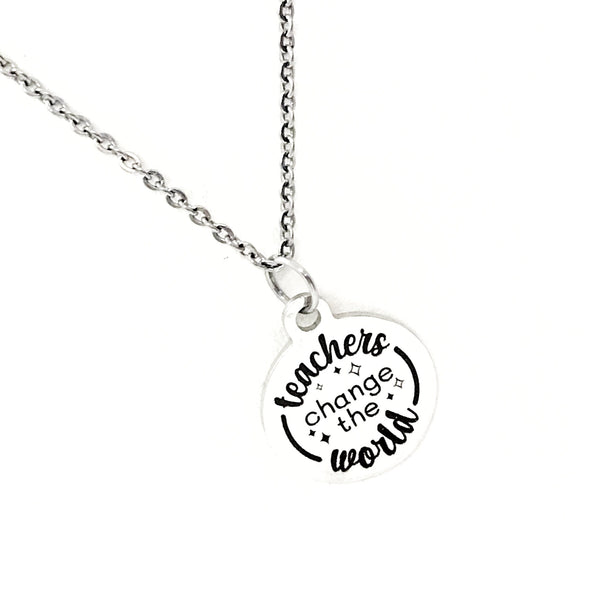 This beautiful teacher necklace gift would make a great back to school gift or gift for a new teacher. The pendant is a stainless steel laser engraved pendant that has “Teachers change the world” on it. The charm measures approx. 3/4 inch across.