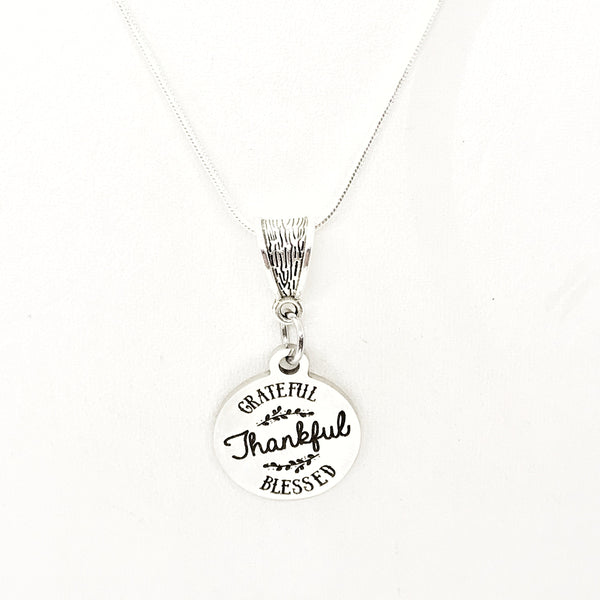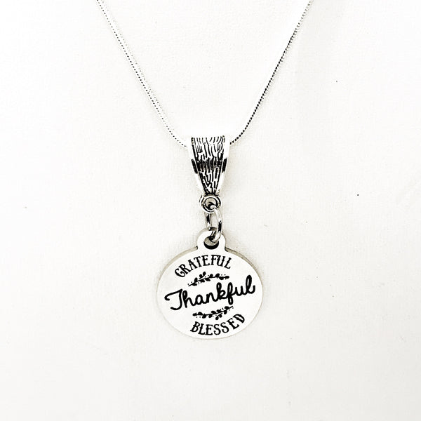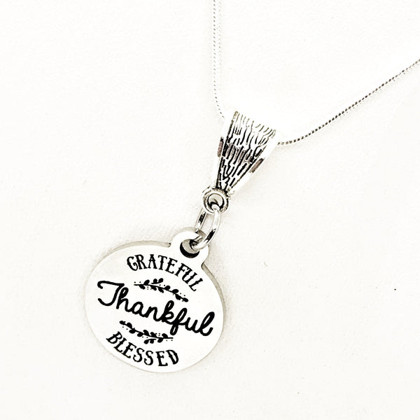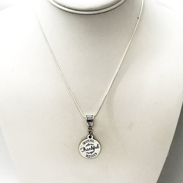This is a stainless steel laser engraved pendant on a silver-plated chain. The pendant says “Grateful Thankful Blessed”