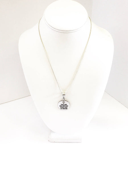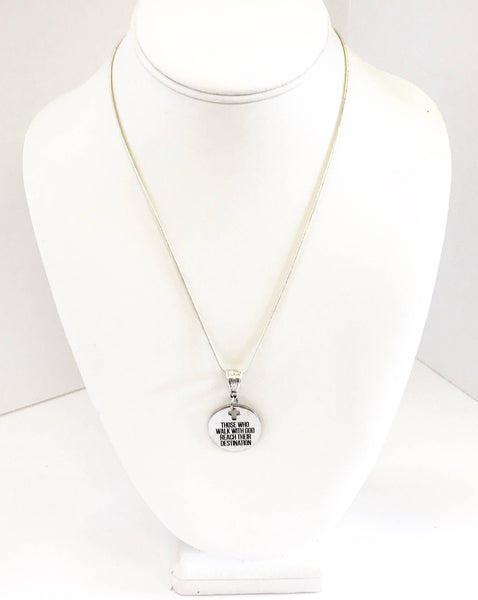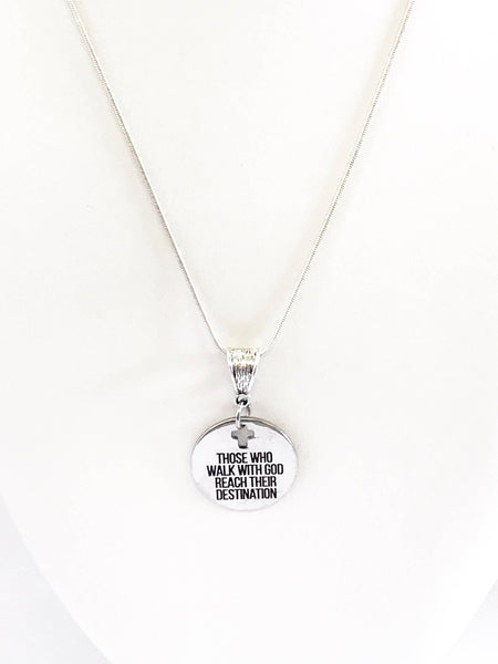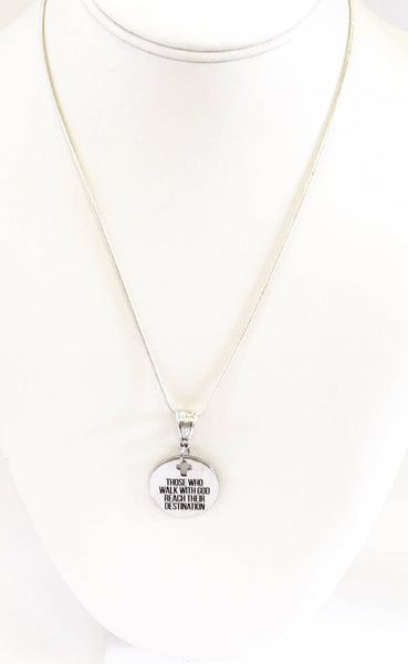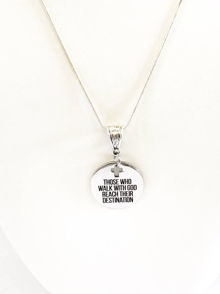This is a stainlses steel laser engraved pendant on a sterling silver plated chain. The pendant has "Those Who Walk With God Reach Their Destination" on it. This pendant is available on your choice of 16, 18, 20, 22, 24, 26, 28 or 30 inch sterling silver chain. The pendant is also available for individual purchase if you have another chain on which you would like to wear it.