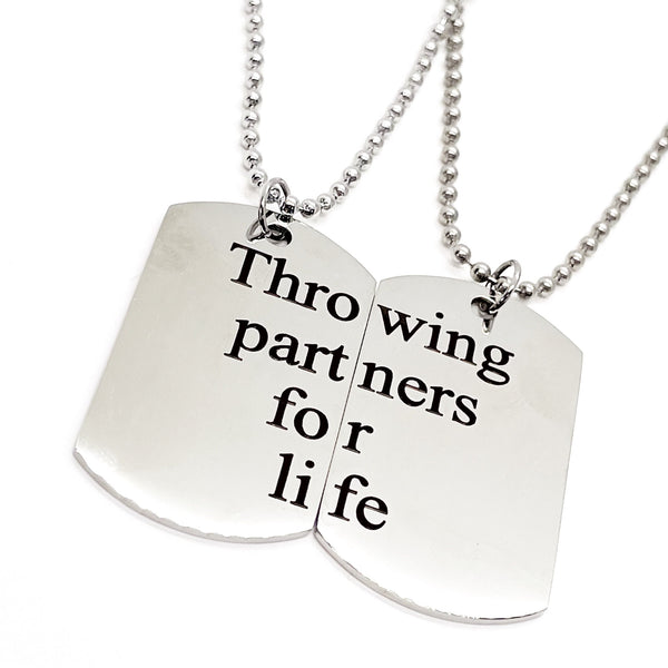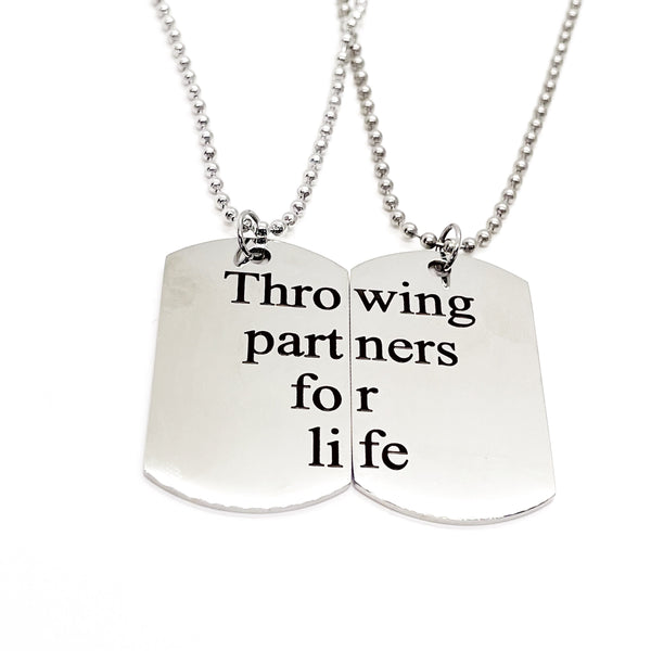 The is a set stainless steel laser engraved charms on 22 inch chains. This necklace set has two pendants that when put together say “Throwing Partners For Life”. It would be a great gift for a baseball or softball pitcher and catcher or father and son that love the game of baseball, father and daughter that love softball or mother and daughter that love softball.