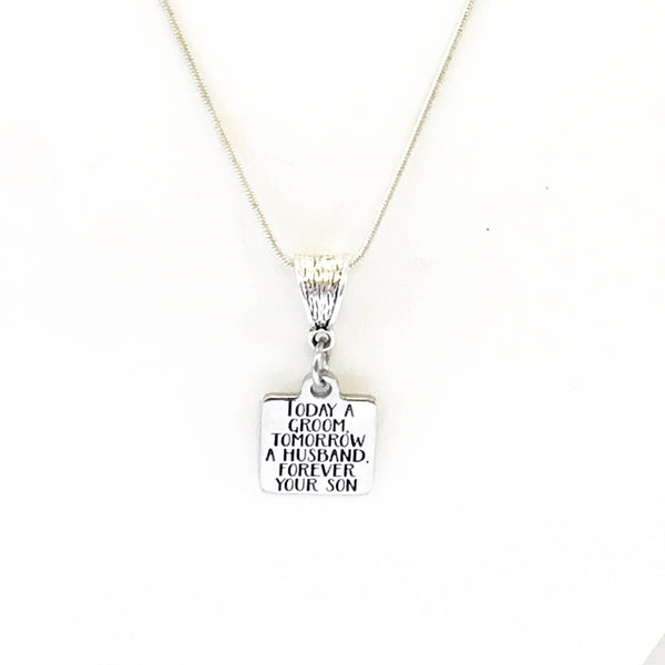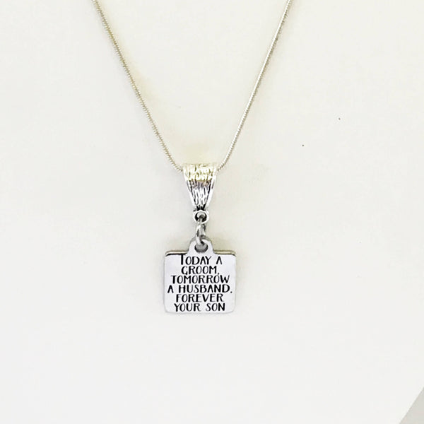 This is a beautiful stainless steel laser engraved pendant with "Today a groom tomorrow a husband forever your son" on your choice of a 16, 18, 20, 22, 24, 26, 28 or 30 inch sterling silver plated snake chain. This would make a beautiful gift to give your mom on your wedding day.