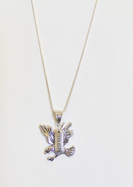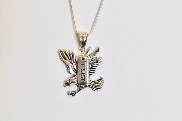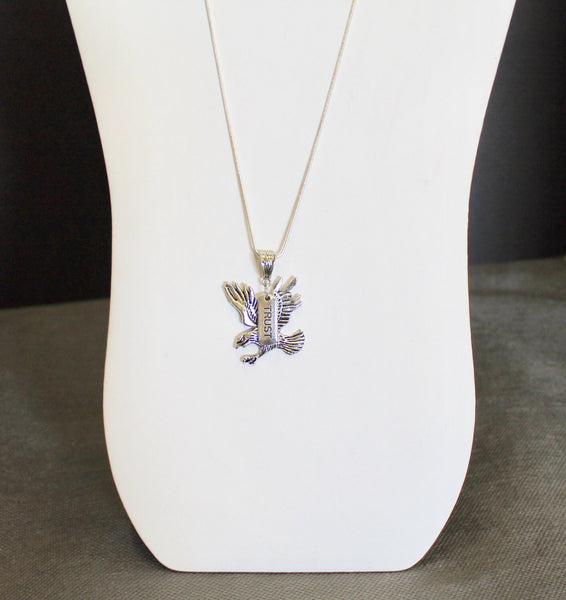 This is a silver tone Trust in the Lord and Soar on Wings Like Eagles pendant on a sterling silver plated snake chain to represent the Bible verse of Isaiah 40:31. This verse reminds us that when we keep our Trust in the Lord, He will renew our strength. This would be a great gift for yourself or a gift for someone you love! This pendant is available on your choice of 16, 18, 20, 22, 24, 26, 28 or 30 inch sterling silver plated snake chain. The pendant is also available for individual purchase if you have another chain that you would like to wear it on.