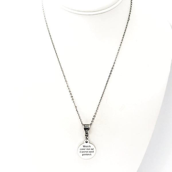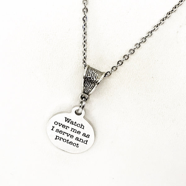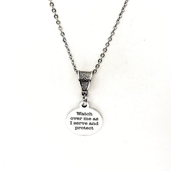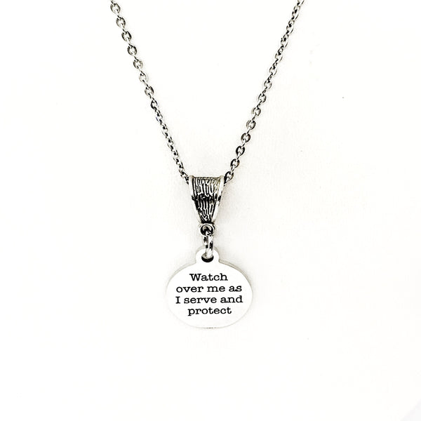 The is a beautiful jewelry piece that has a stainless steel laser engraved charm with “Watch over me as I serve and protect” on it. The charm measures approx. 3/4 inch across.
