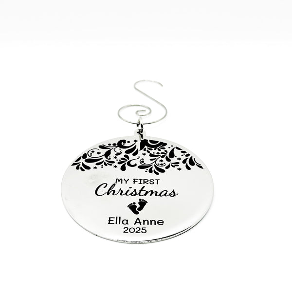 Celebrate your little one’s first holiday season with this beautifully engraved My First Christmas ornament. Crafted from durable stainless steel, this 60mm (2.4 inches) round ornament features elegant floral detailing and can be personalized with your baby’s name and birth year. Perfect for commemorating baby’s first Christmas, it makes a timeless keepsake for parents, grandparents, or godparents. Hang it on the tree or display it as part of your holiday décor to remember this magical milestone year after year.